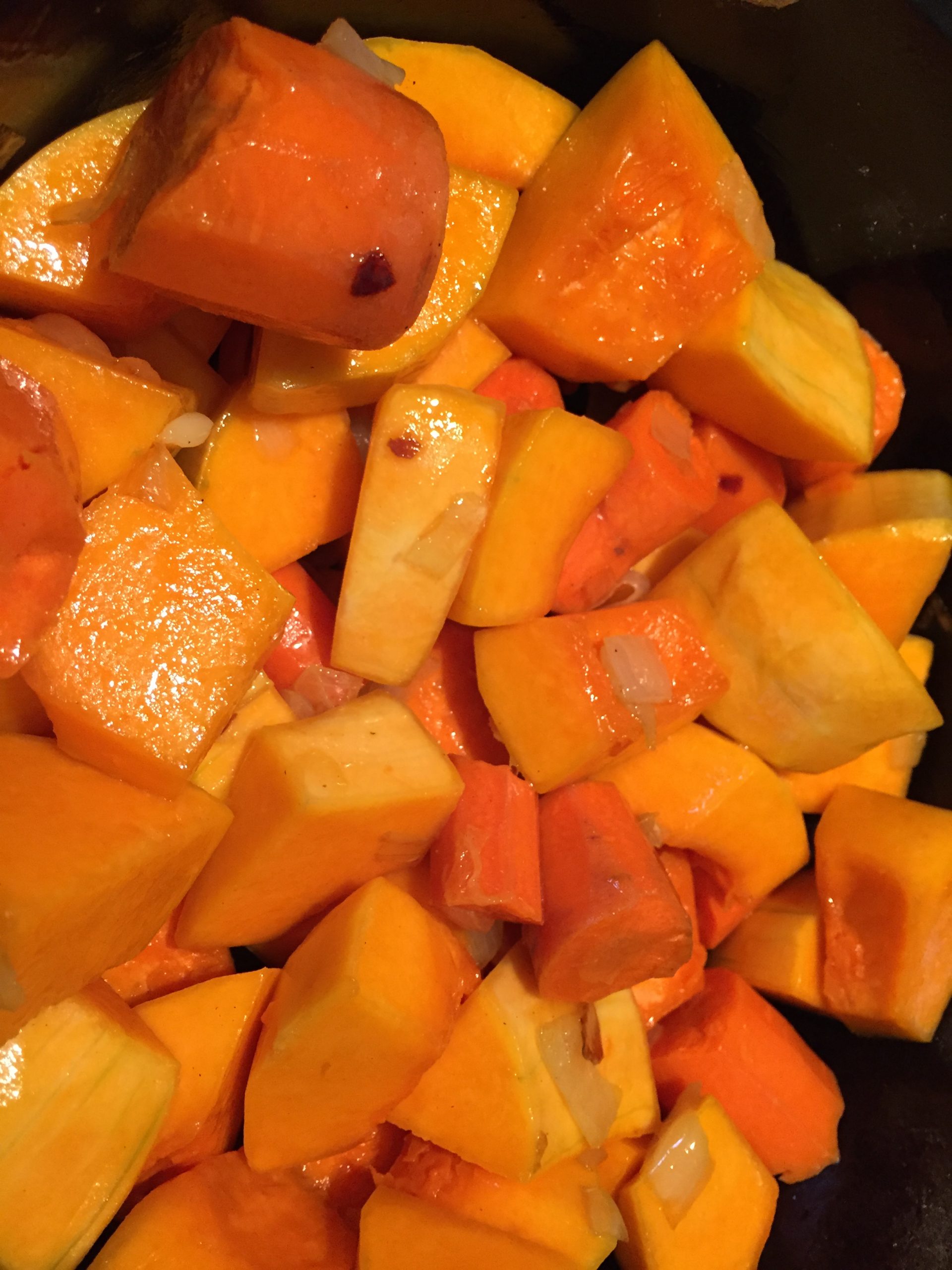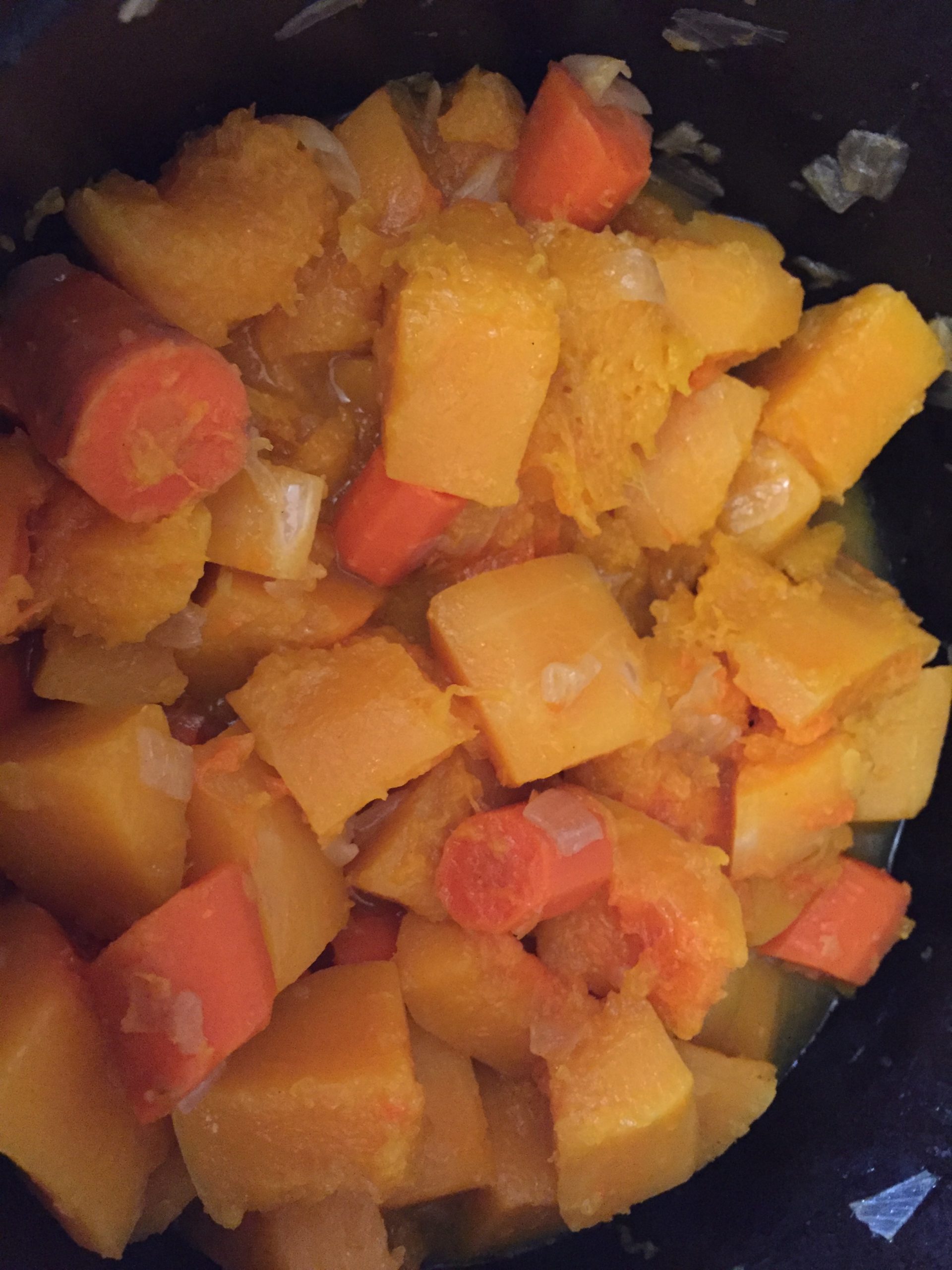 In order to get a rich taste for this butternut squash soup, I caramelize the vegetables with a mixture of butter and olive oil. Heat the olive oil in the pan first before adding the butter. Since the butter has a lower smoke point than olive oil, the temperature at which an oil starts to burn and smoke, it is good to combine the two fats in order to caramelize the vegetables without burning the butter. NO liquid is added when the vegetables are cooking to maximize the butternut taste and sweetness of the vegetables.