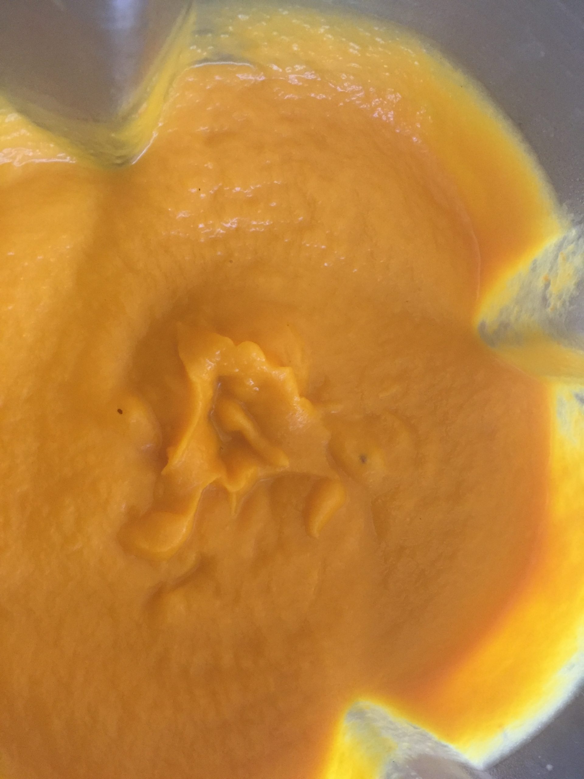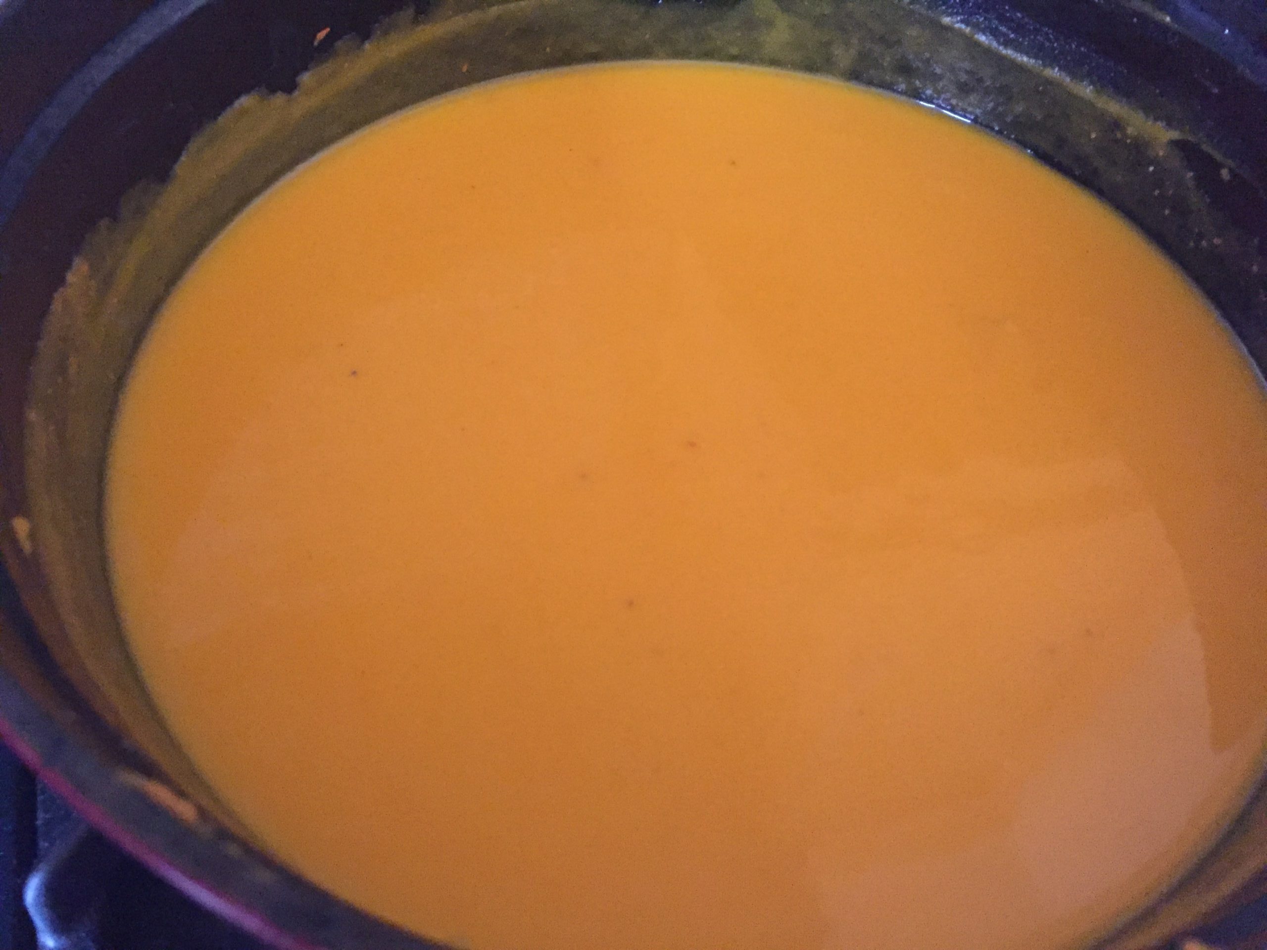 After removing the pureed butternut and putting it back into the Dutch oven, add the chicken stock into the blender, turn on the motor and "clean" the blender to avoid having to struggle to get the rest of the puree out with a spatula. Pour that mixture into the Dutch oven.