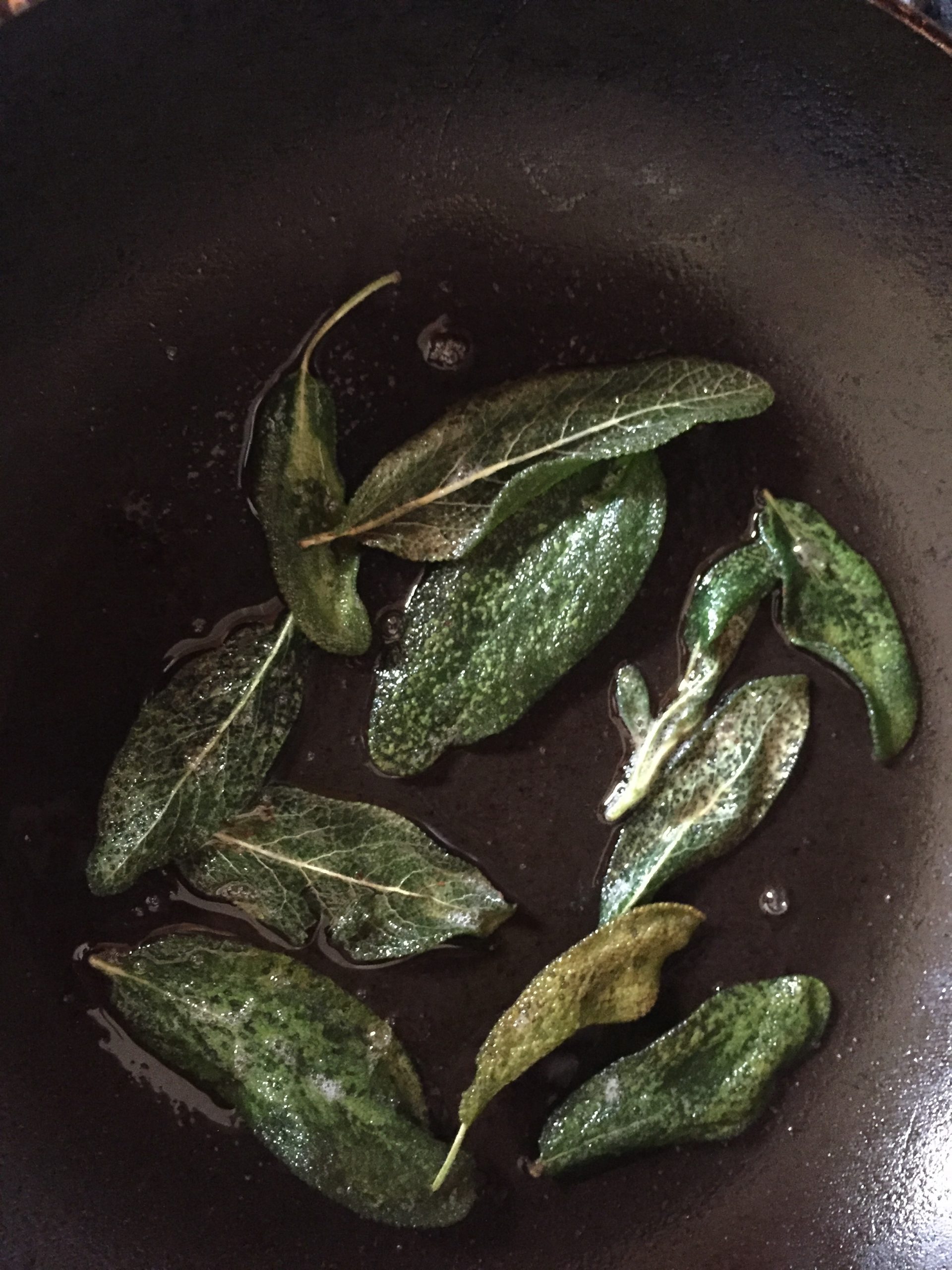 Caramelizing sage leaves.