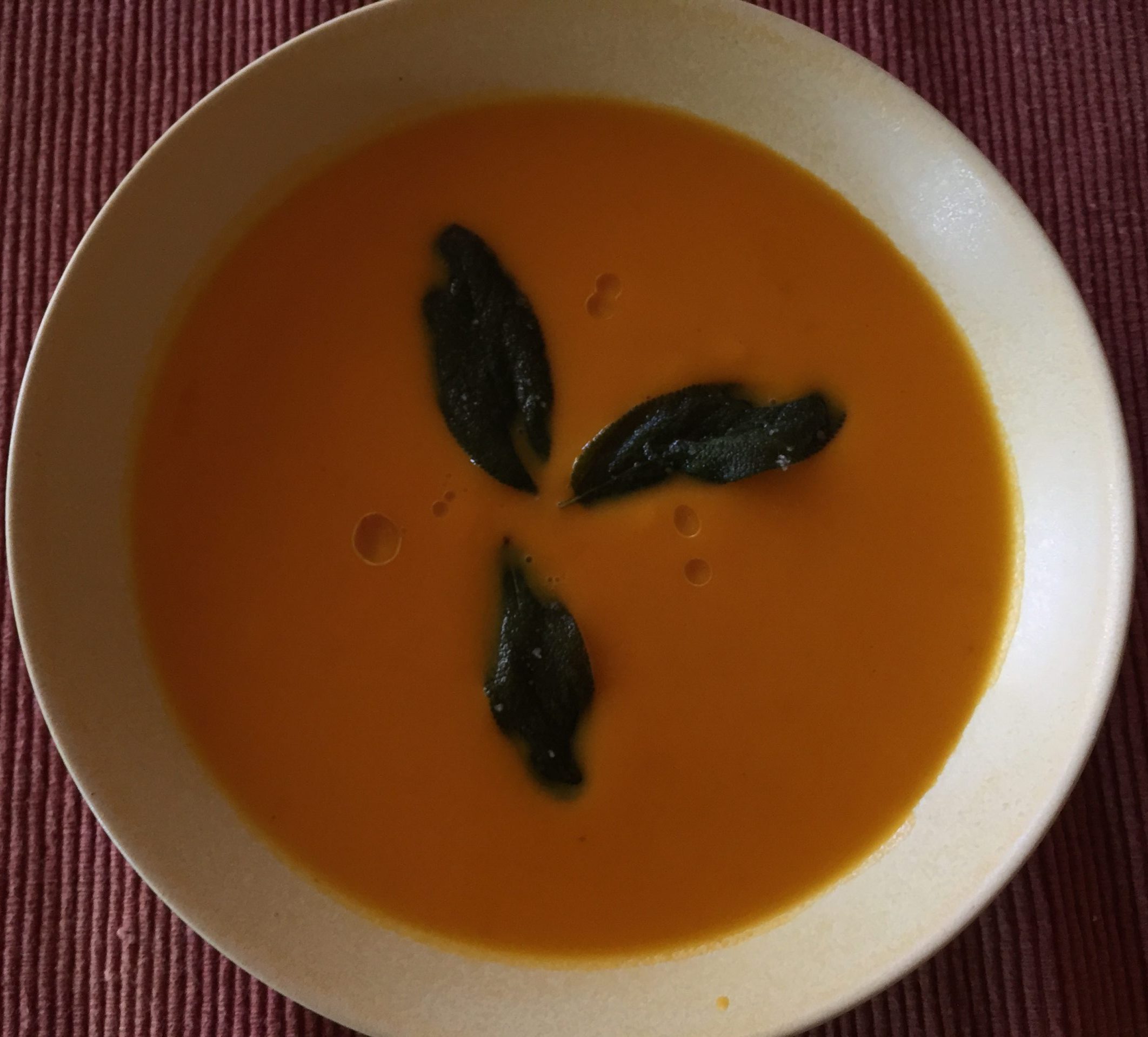 I made this soup last night. It’s easy to make and it tasted really good. There’s sweetness to it and creamy. I used nutmeg instead of mace. The sage leaves smelled so good in the kitchen that I felt the Christmas spirit paired up with the cool weather. I’ve never had fried sage before and it’s a great experience.