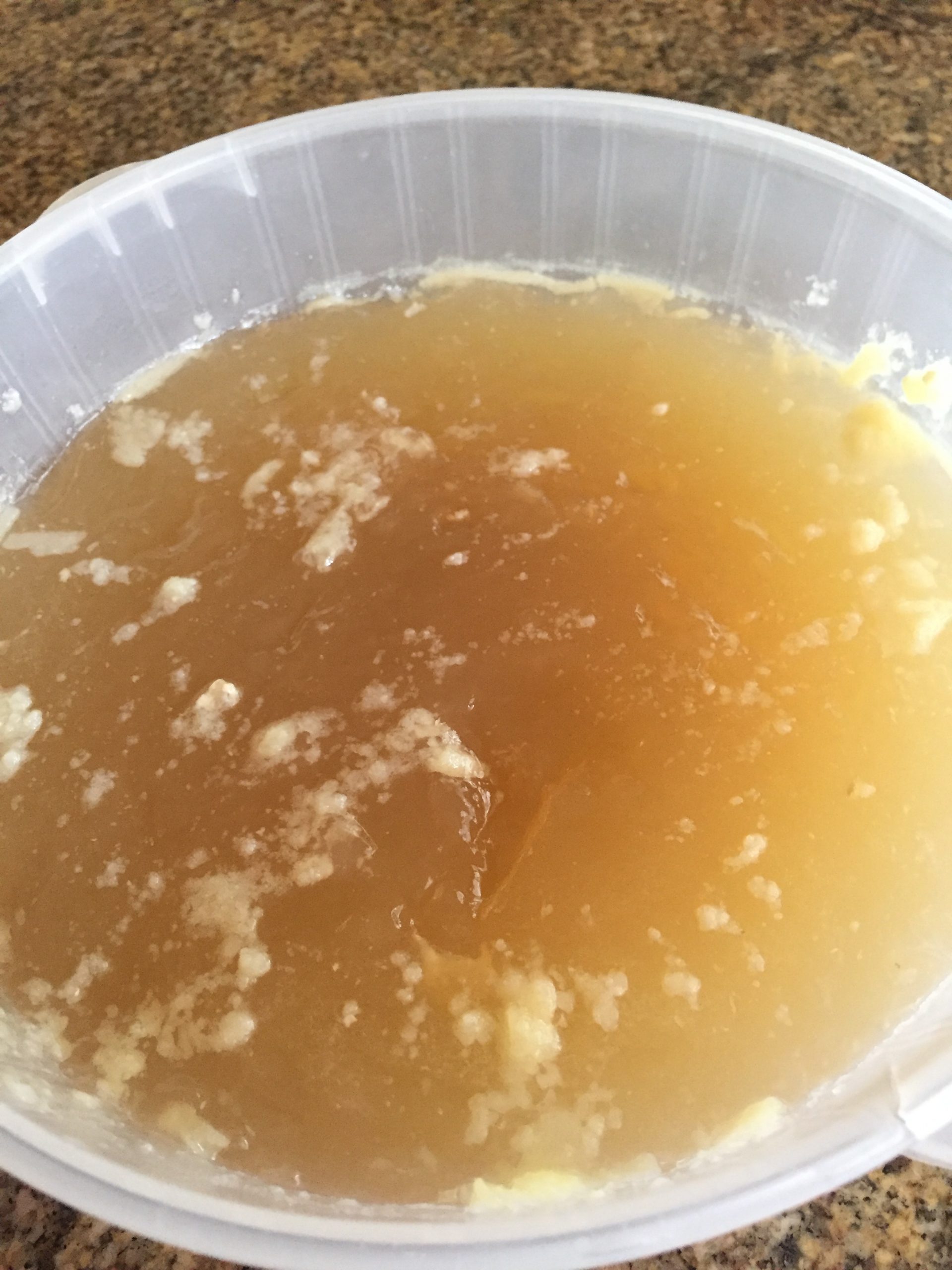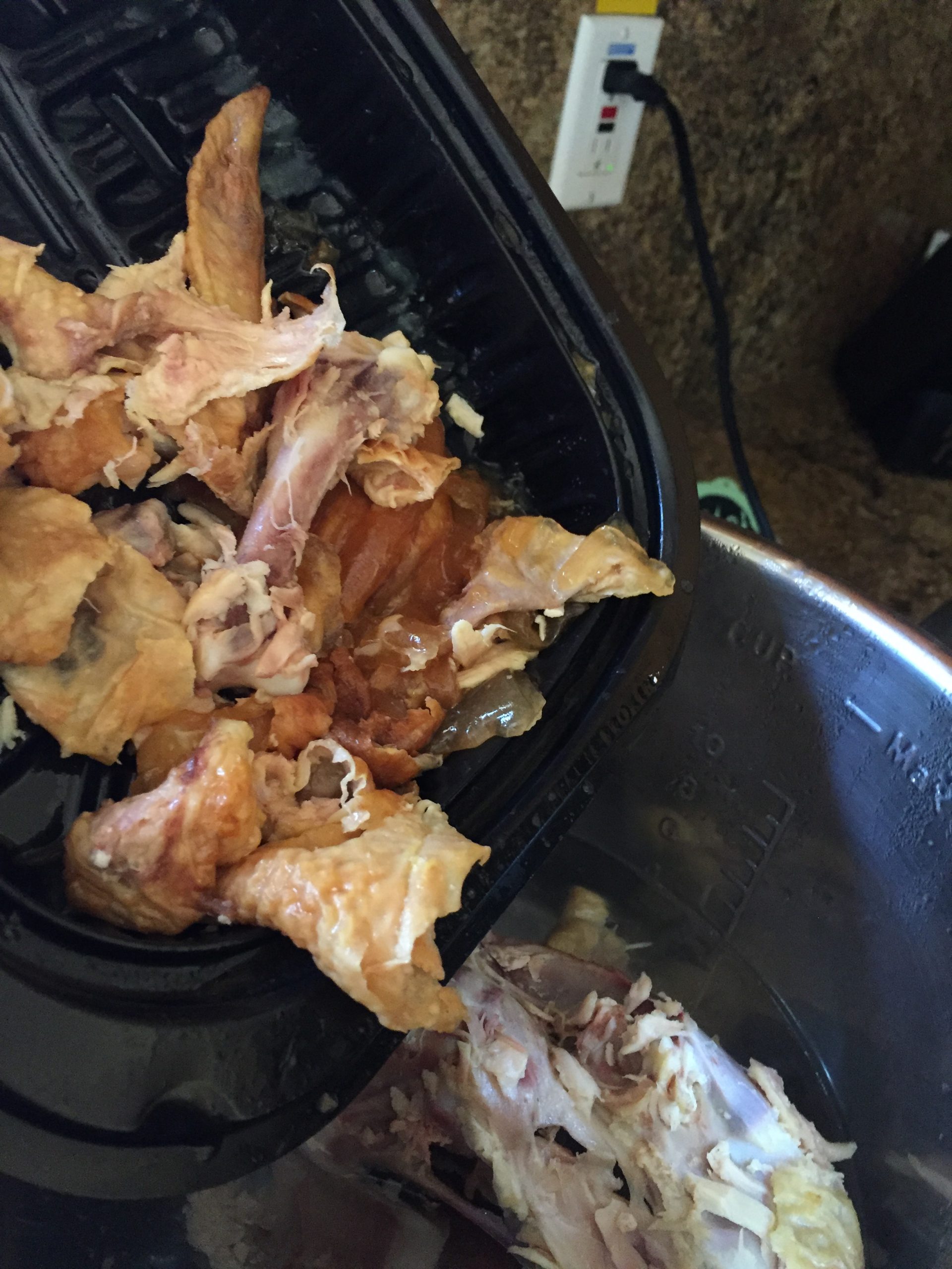 - Whole rotisserie chicken carcass. Skin, bones, gelatinous juice from container