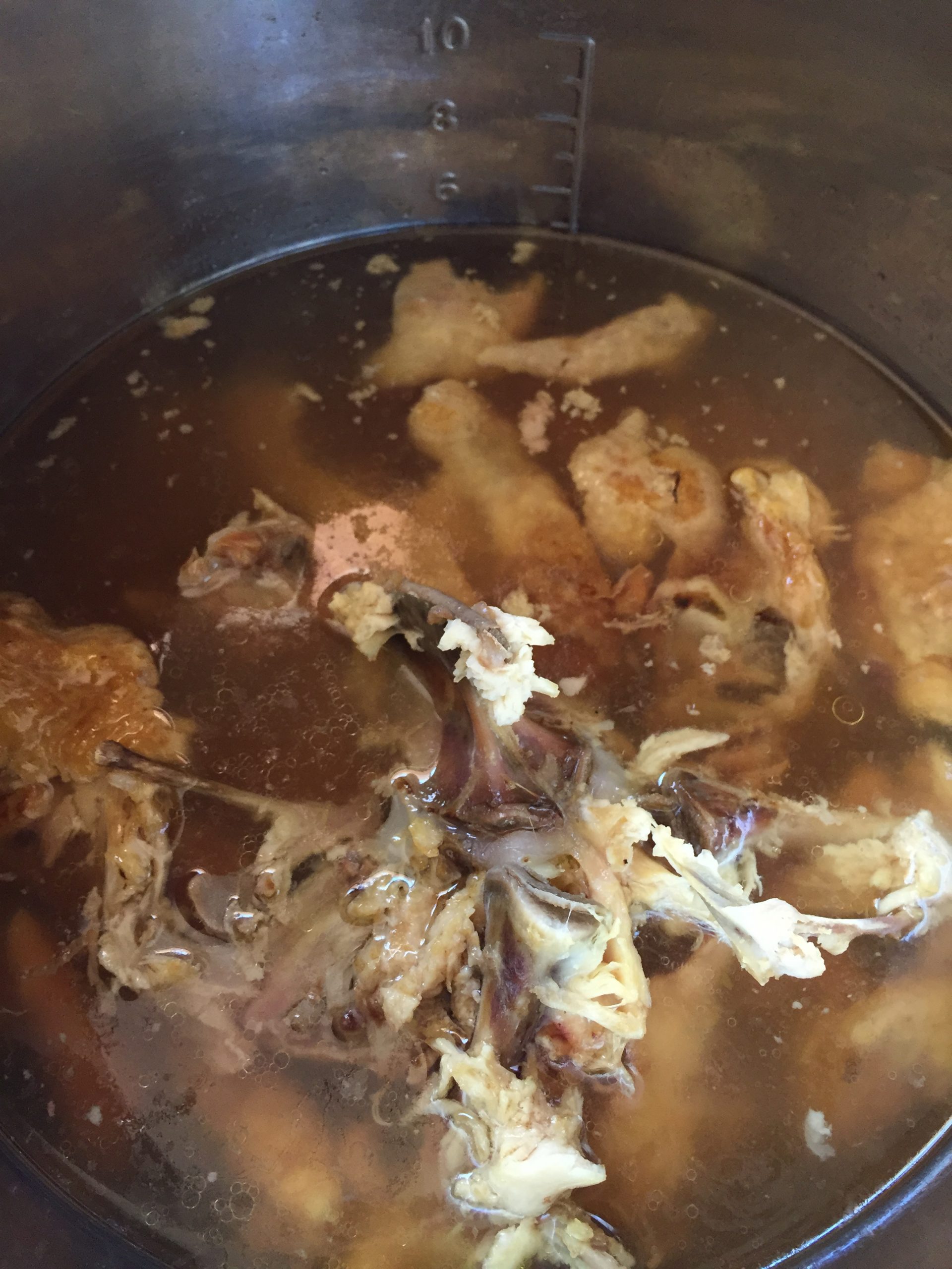 A good broth should be gelatinous because all the calcium has been leached out into the broth. Use this broth as a base for a delicious chicken vegetable soup or a Chinese chicken soup.