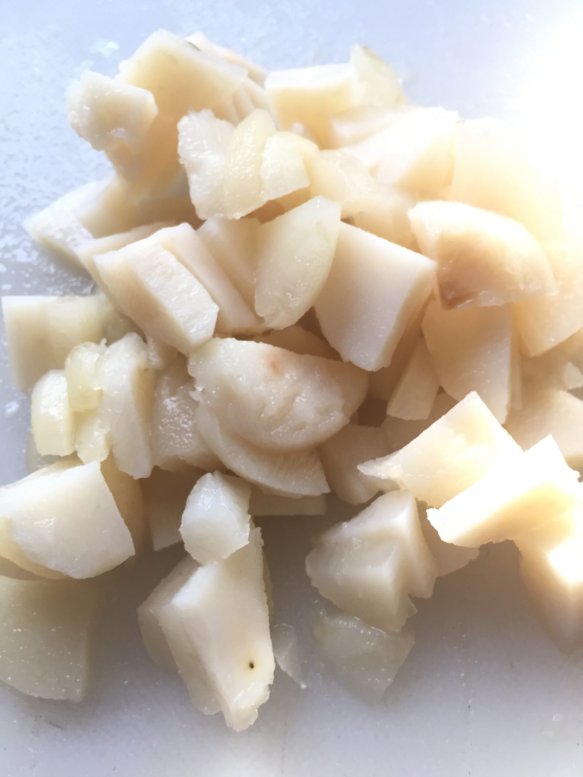 - Add diced water chestnuts and preserved vegetable into pork mixture