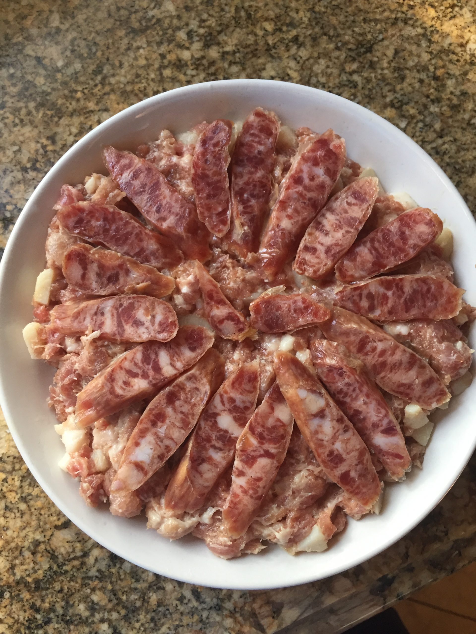 I grew up with up with Chinese steamed pork with Chinese sausage that Grandma used to make. She taught me how to make it and it was very simple. I always thought there was something missing in that recipe though. I realized that it was the mouth-feel. Perhaps it was because Grandma had no teeth, but it needed some crunch and a better texture. Grandma used to just season fine ground pork, add some Chinese sausage and steam it. I decided that the pork cut was important and additional ingredients needed to be added as "surprises."