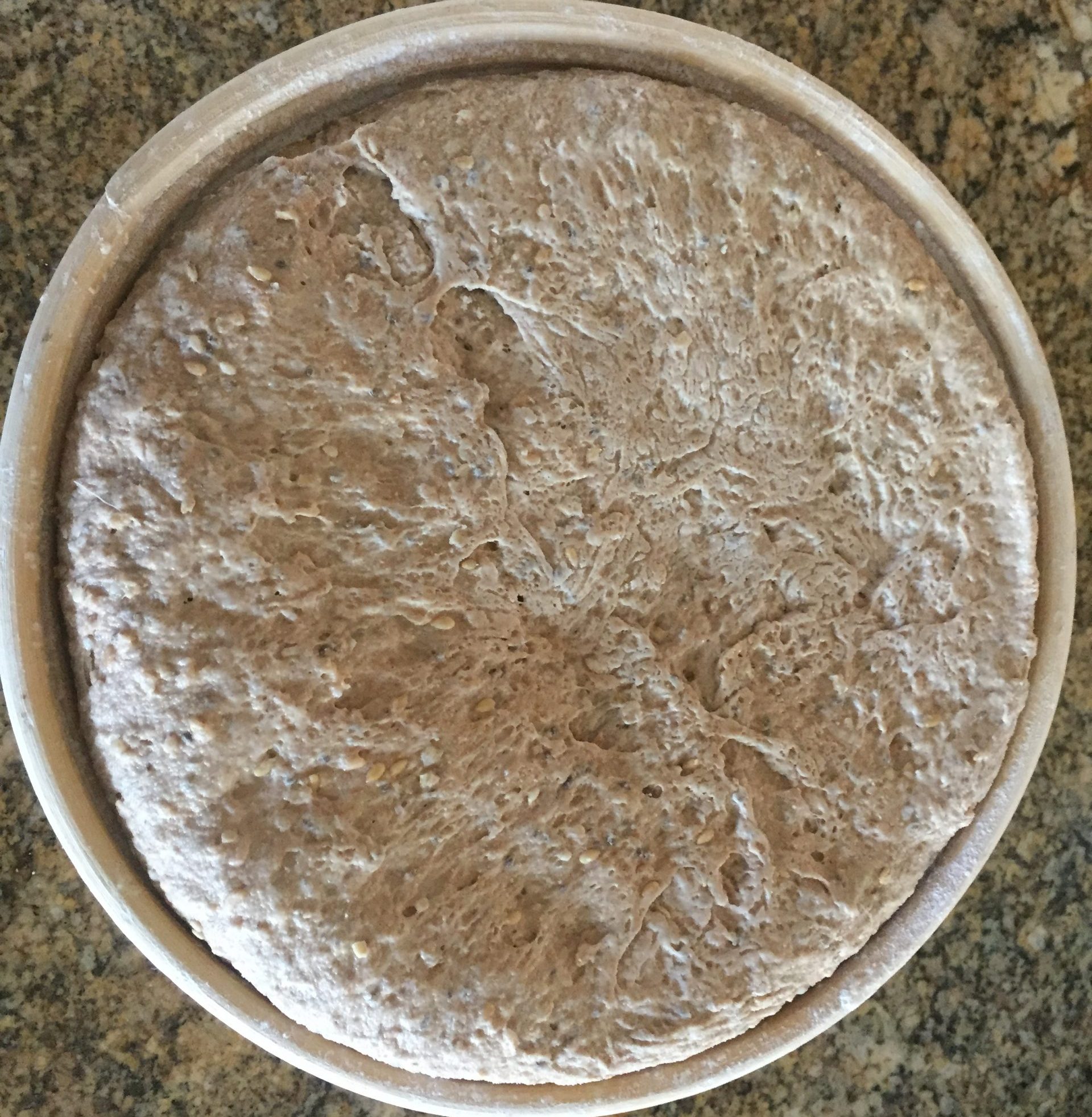 In order for the sourdough lactobacilli to penetrate the outer shell of the wheat germ, it requires time. This process breaks down the flour and maximizes the bread's nutrition. I have found that a longer autolyse process, and an hour of warm fermentation before putting it into the fridge for a 36 hour cold proof helps make this high fiber bread less dense and moist. (The chia seeds also help!) It also results in a fabulous ear for those who care about their sourdough aesthetics!