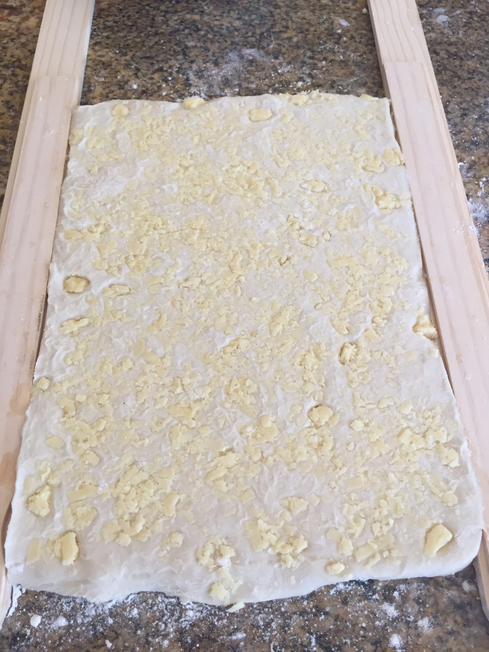 I used to just eye-ball the dough thickness until my sister showed me her dough measuring sticks. You can also use rolling pin bands that you put around your rolling pin. These aids are great for making a pastry dough of uniform thickness. However, I have found that you can get FREE measuring sticks that work well. PAINTSTICKS!