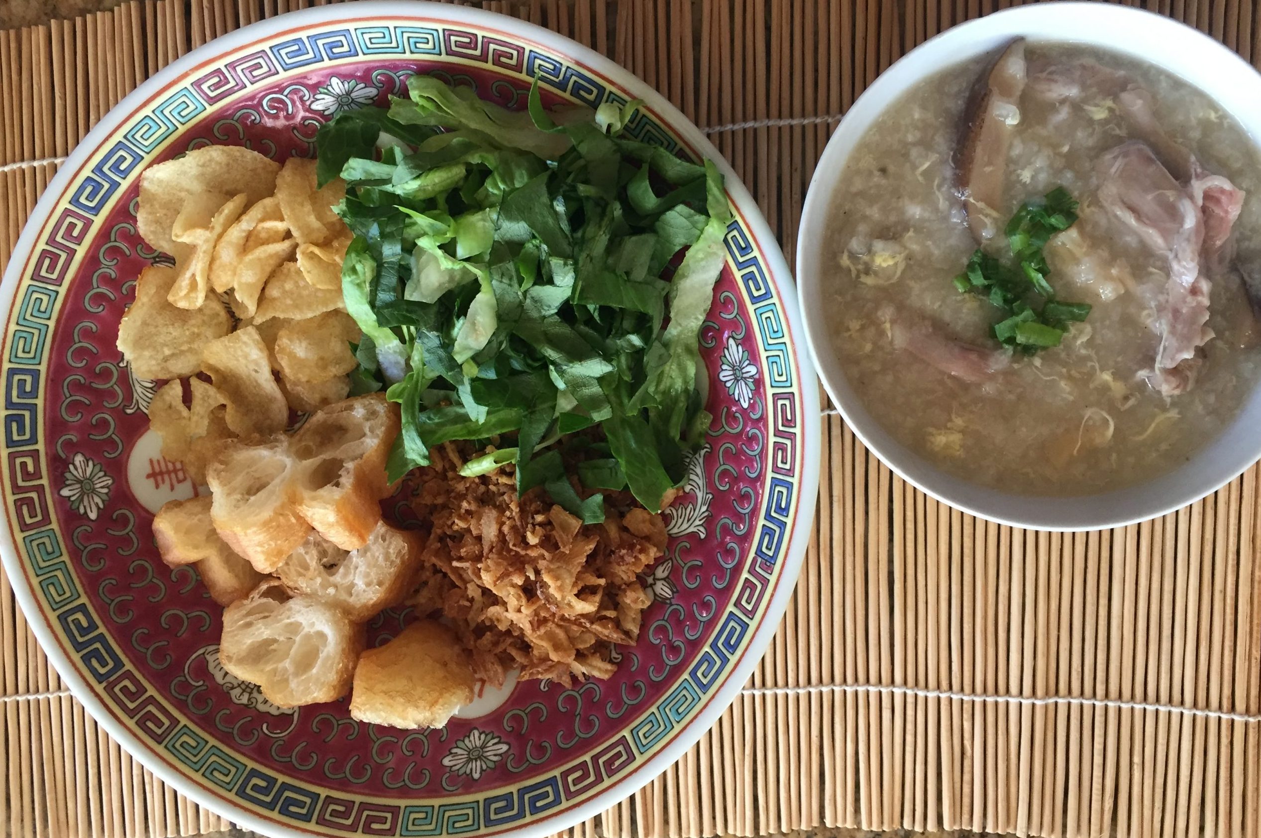 Rice congee or jook is a Chinese staple.  My grandmother used to make it for us when anyone was sick. It was a hearty soup when the weather got cold, a definite comfort food. It was the equivalent of chicken soup for the soul!  You can make it with any protein...fish, pork, egg, chicken and even turkey!