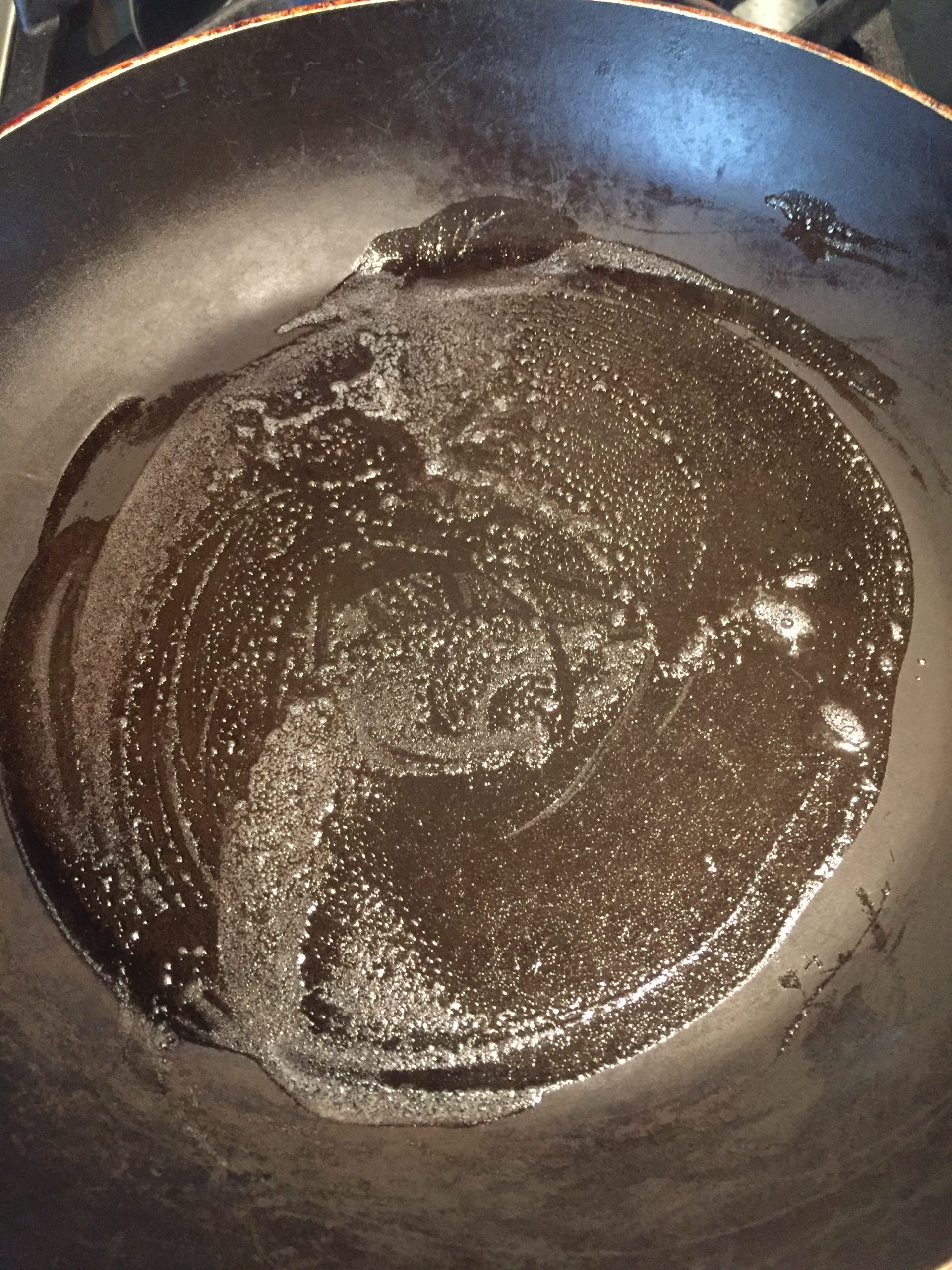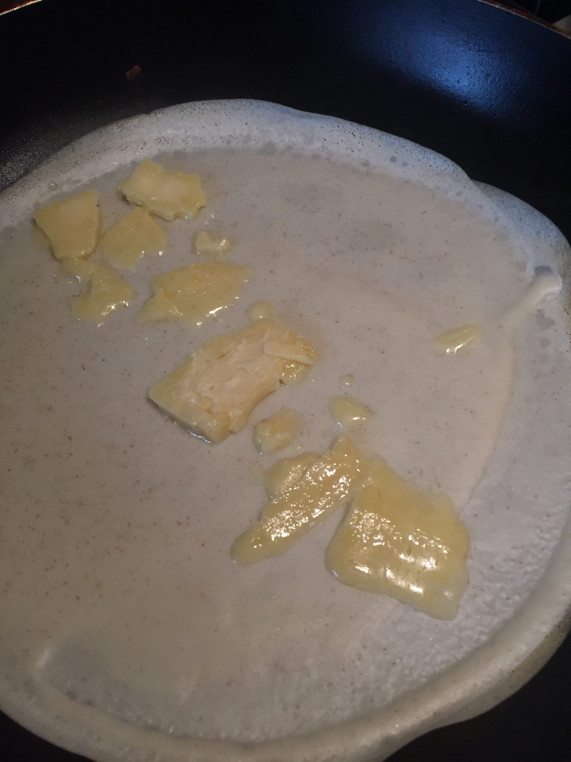 I cover the pan which allows the batter to cook. If you have a lid that allows the steam to escape, all the better! The crepe is ready when the sides are crisp and seems to be separating from the pan.