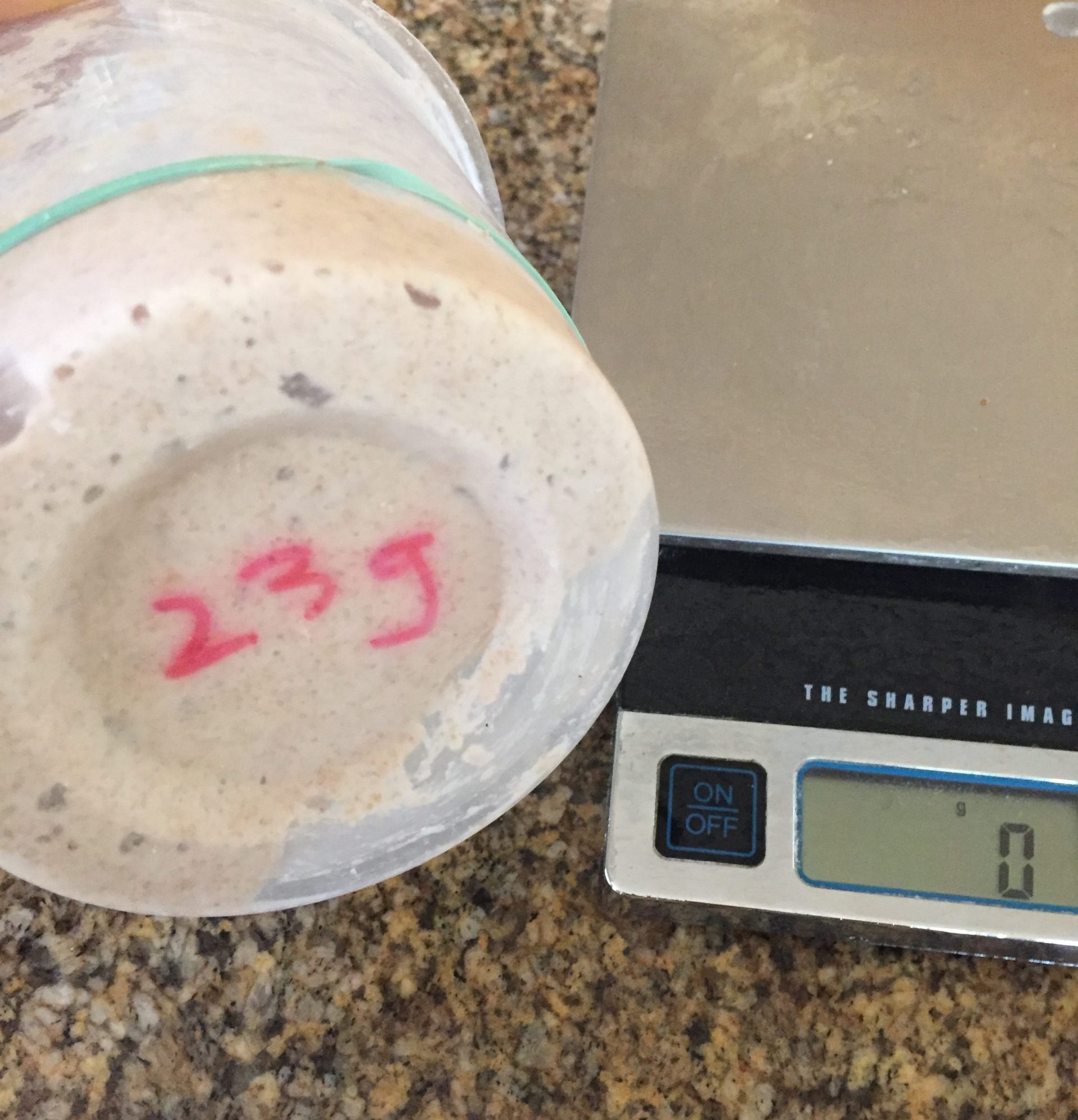 - Remove 20 grams of your starter and place it in a different container or remove as much starter that will leave 20 grams (This is the reason for measuring the weight of your container and writing it down on the underside of the container with the sharpie).