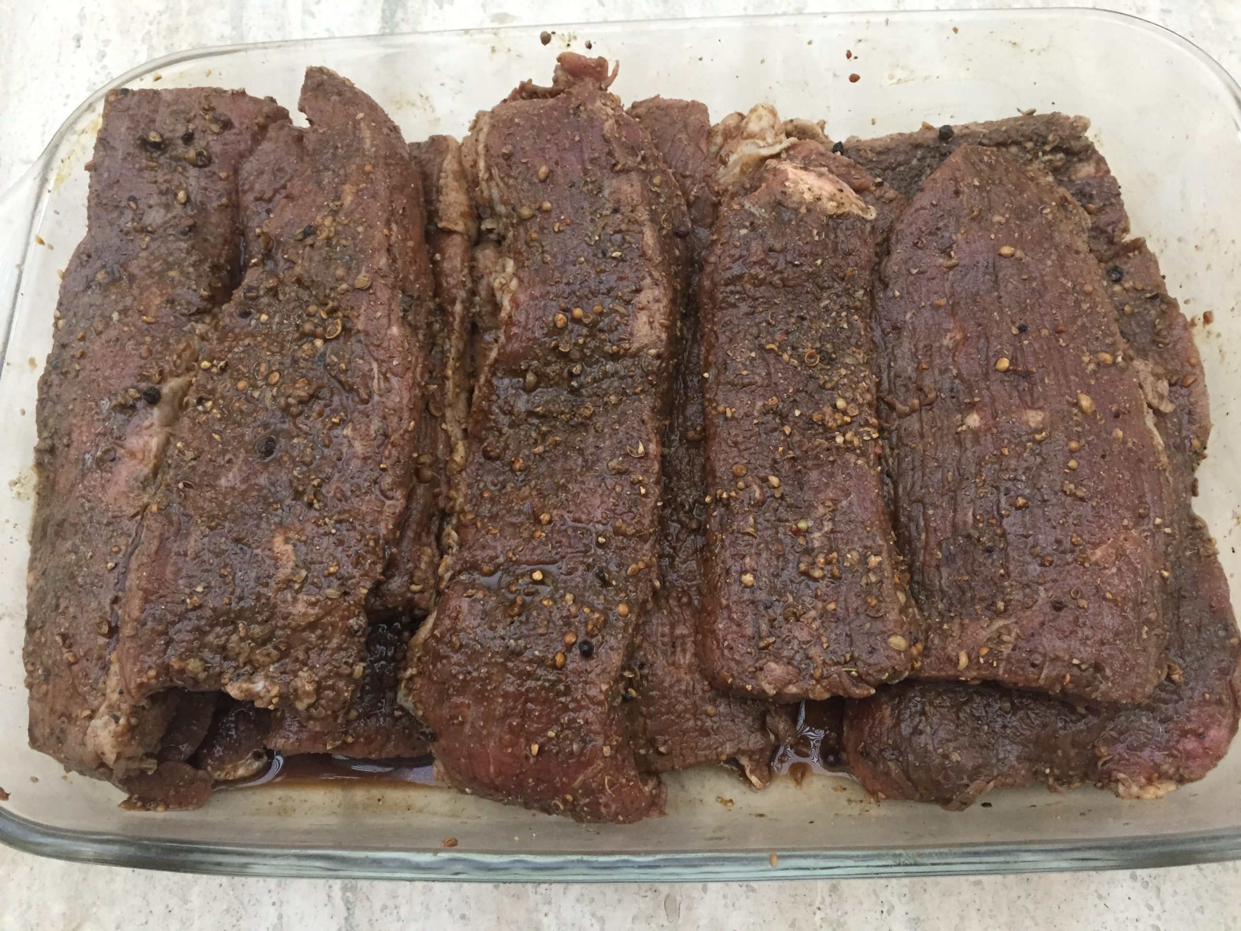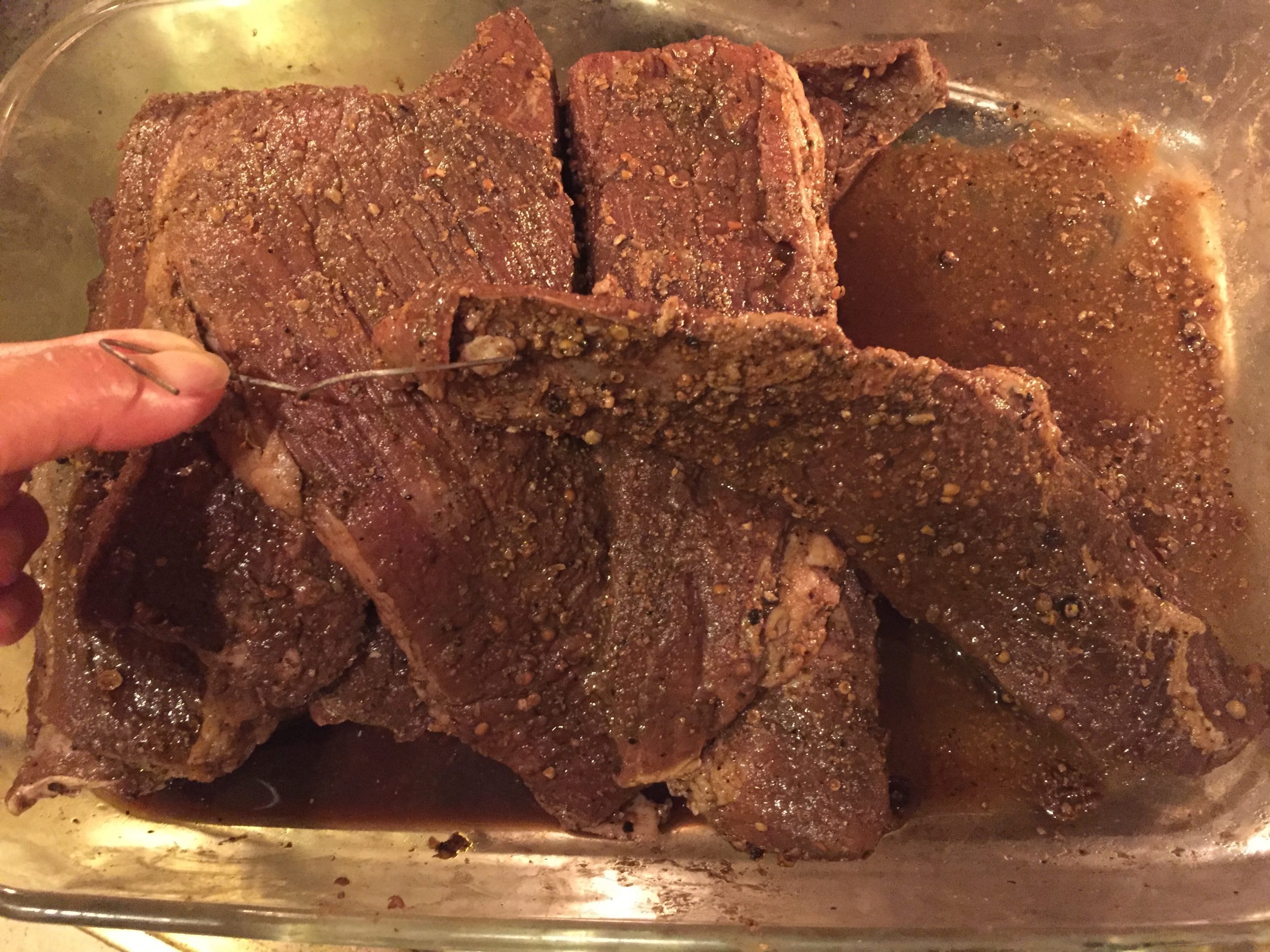 - Let the meat cure and marinate for at least 24 hours and up to 48 hours. Make sure you turn the meat over at least twice to ensure that all the meat marinates in the seasoning liquid so that the flavor is evenly distributed. After 12 hours, the vinegar should cause the meat to feel firmer.