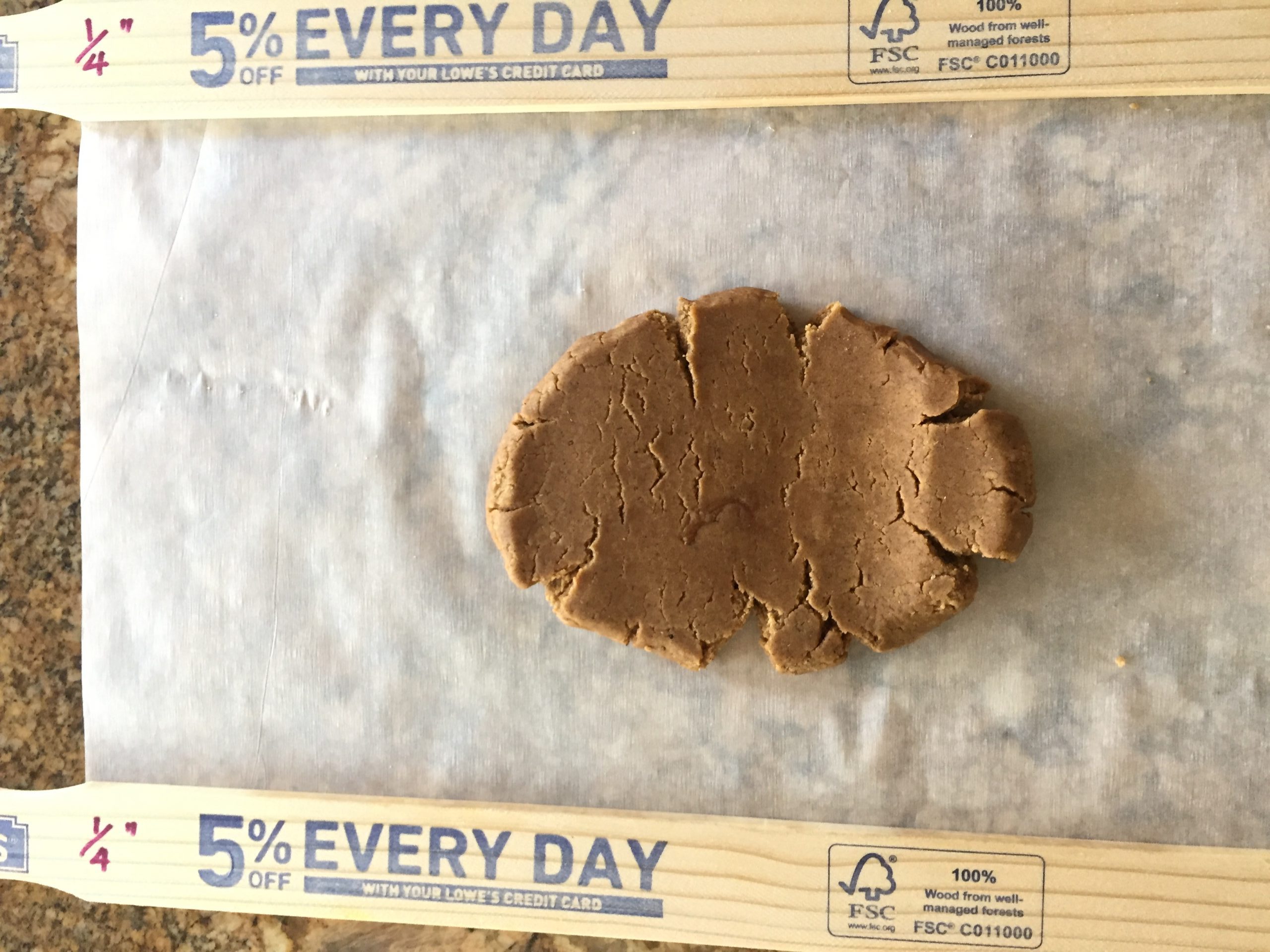 Place the sticks on either side of the dough, place the parchment paper on the top and roll along the sticks until the rolling pin reaches the height of the sticks. This will result in straight and uniform cookie dough.