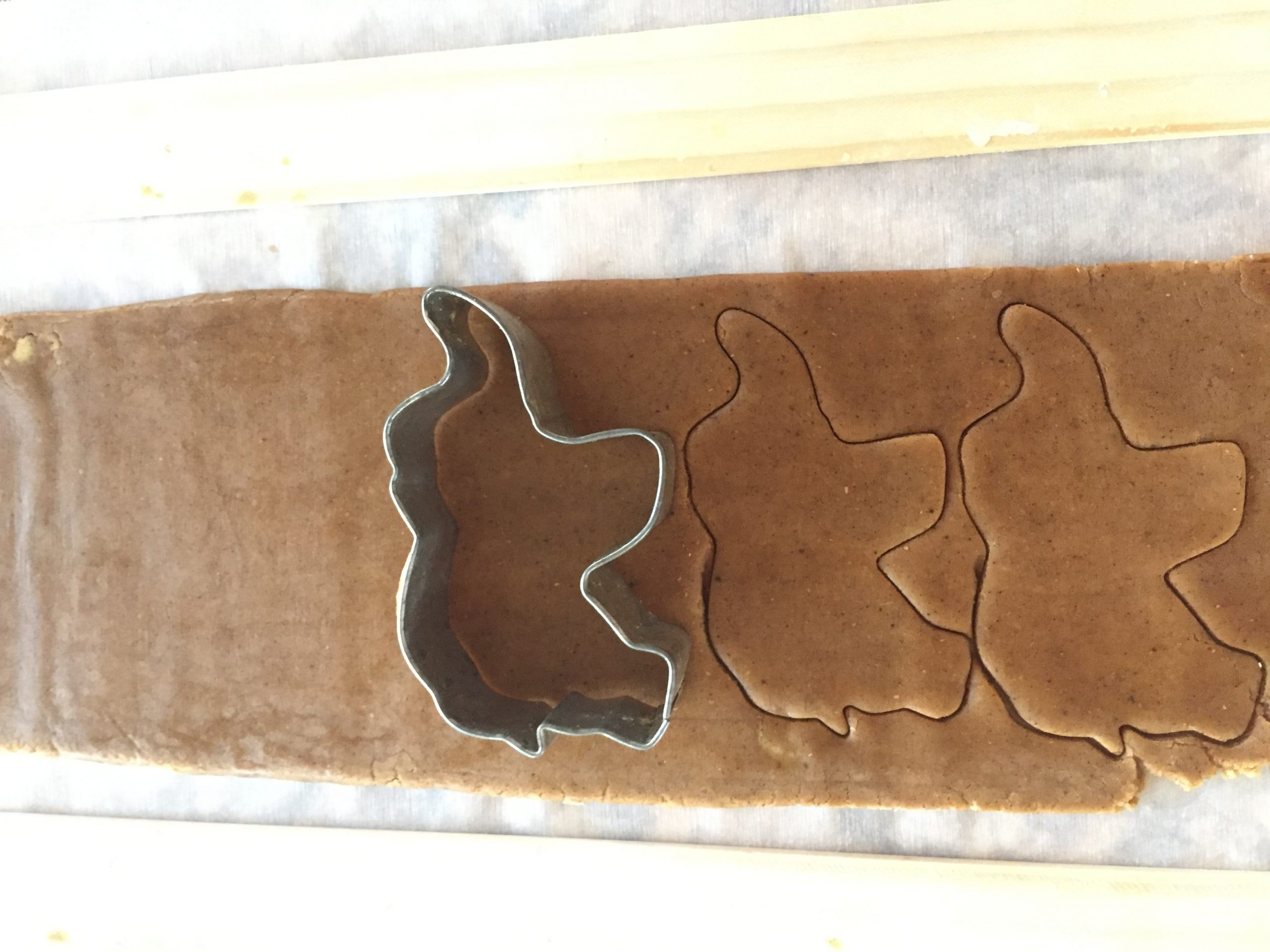 For thicker gingerbread cookies, the dough should be rolled to 1/4" or 6 mm thickness. For thinner, crispier cookies, the dough should be rolled to 1/8" of 3 mm thickness. I discovered that FREE paint sticks are excellent tools to get your dough thickness uniform. One gallon paint sticks are 1/8" and five gallon paint sticks are 1/4" thick. Most hardware stores that sell paint will give these away for free!