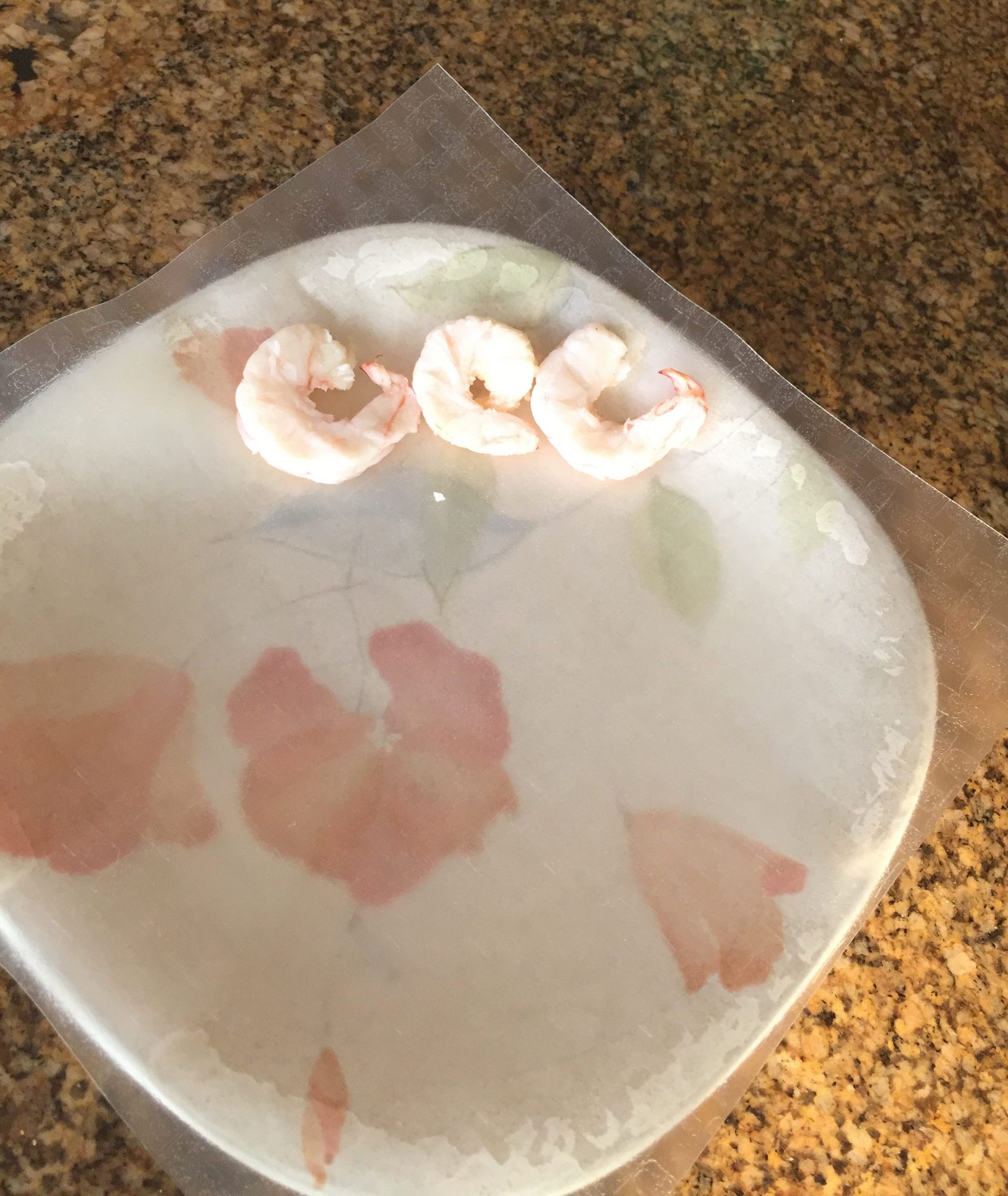 The wrapper, when it does eventually soften, becomes somewhat tacky. I prefer to roll my wrapper on a plate that is slightly smaller than the wrapper which gives me access to the wrapper that overextends the plate. For either square or circular wrappers, place your "display ingredient", usually shrimp or any protein, a third of the way down from the top of the wrapper.