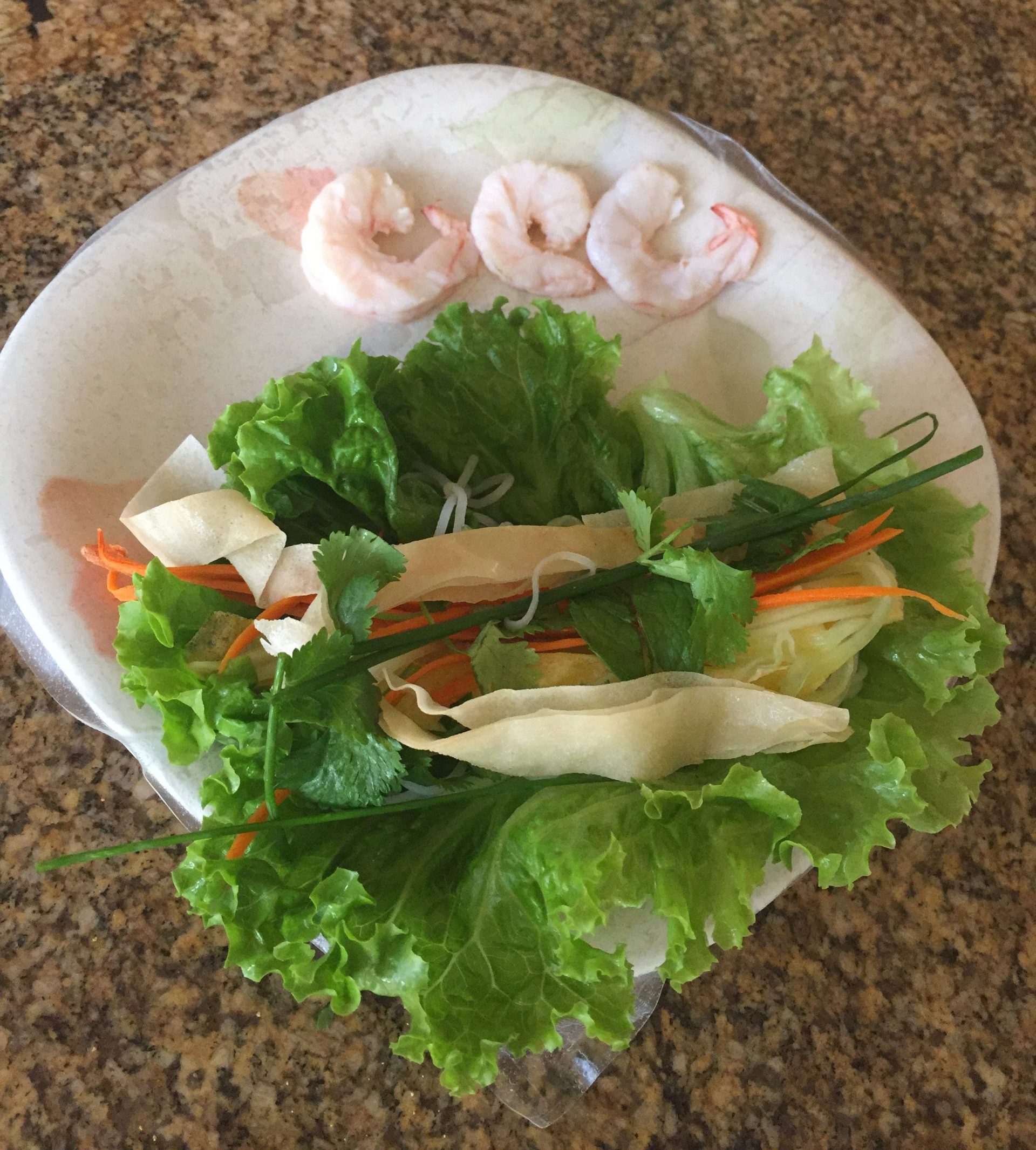 The sky's the limit. I usually have an assortment of protein and veggies such as carrots and cucumbers that I julienne cut, with my mandoline. I also have blanched bean sprouts and chives. It's easier to assemble the rolls when all your ingredients are in strips except for the lettuce leaves. The lettuce leaves should envelop all your other ingredients so these should remain large. Try using just the tender parts so that it forms a roll.