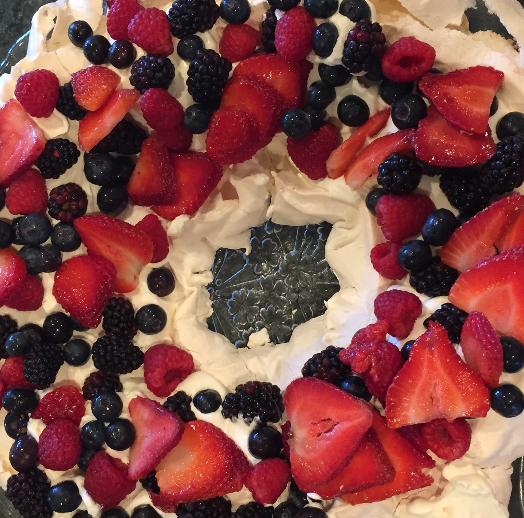 You can either make one large shell or individual nests. They do not have to be perfect looking because when you add the cream and berries, you don't really see the shape of the pavlova. To make individual nests, you can either use a piping bag with a big tip or place the mixture in a large zip-loc bag and cut the corner of the bag. (A very cheap and easy piping bag!) Just remember to adjust the baking time accordingly if making individual pavlova nests. See Pavlova Options.