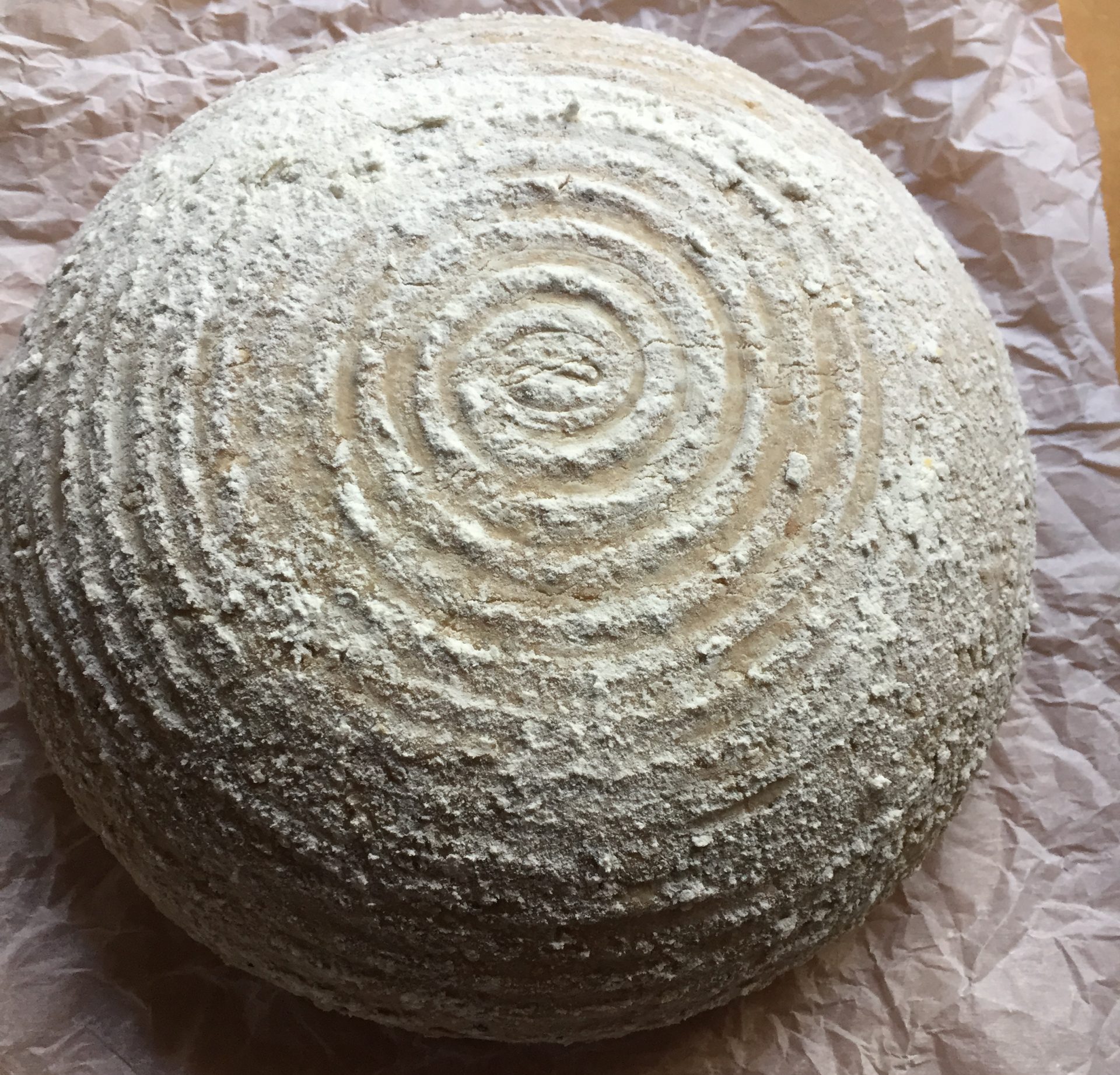 - Transfer dough to banneton with seed side down and let rest at room temperature (75° fahrenheit or 24° celcius) for 1 hour. (Closed oven with just the oven light works well for cold temperatures)