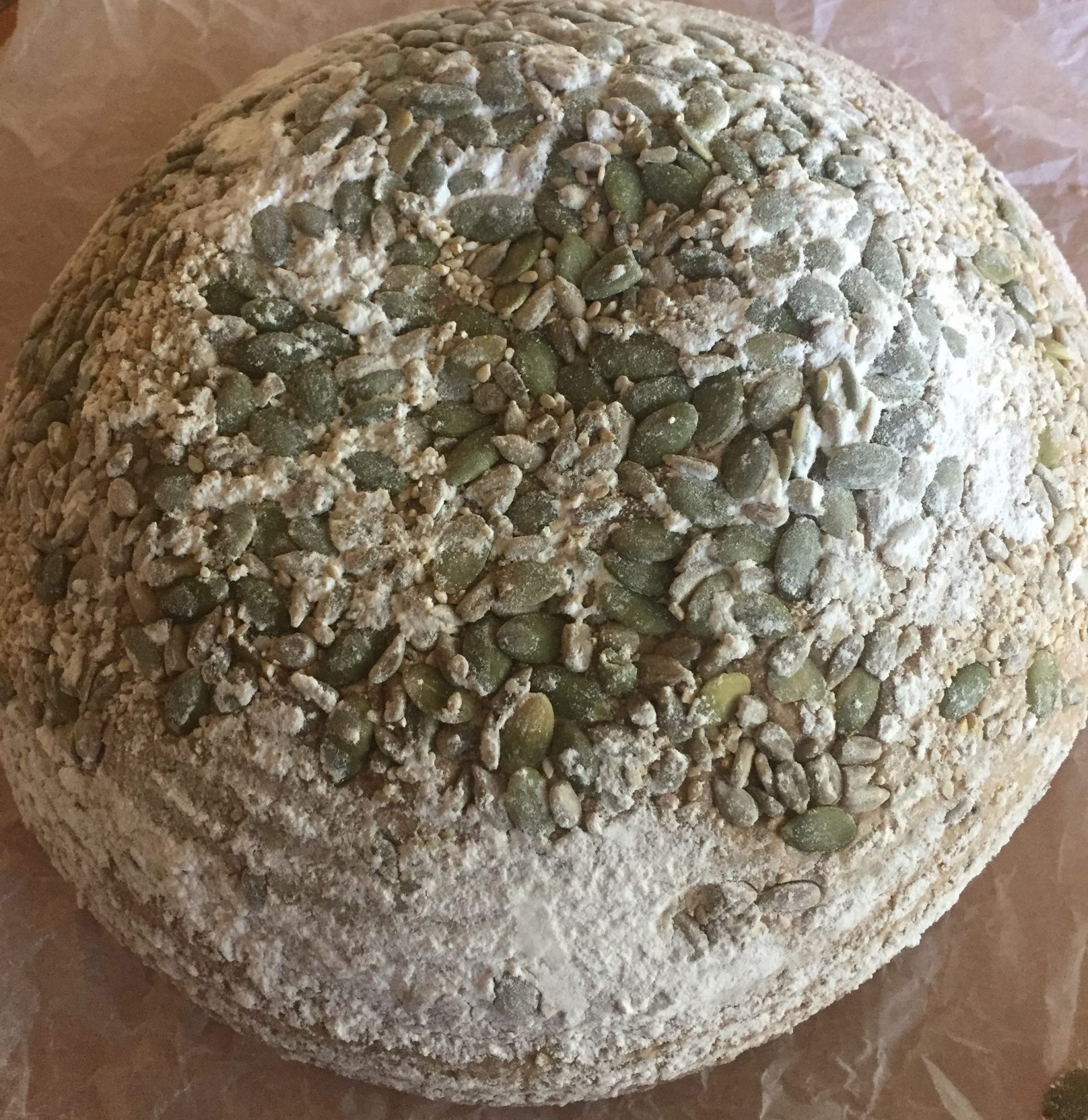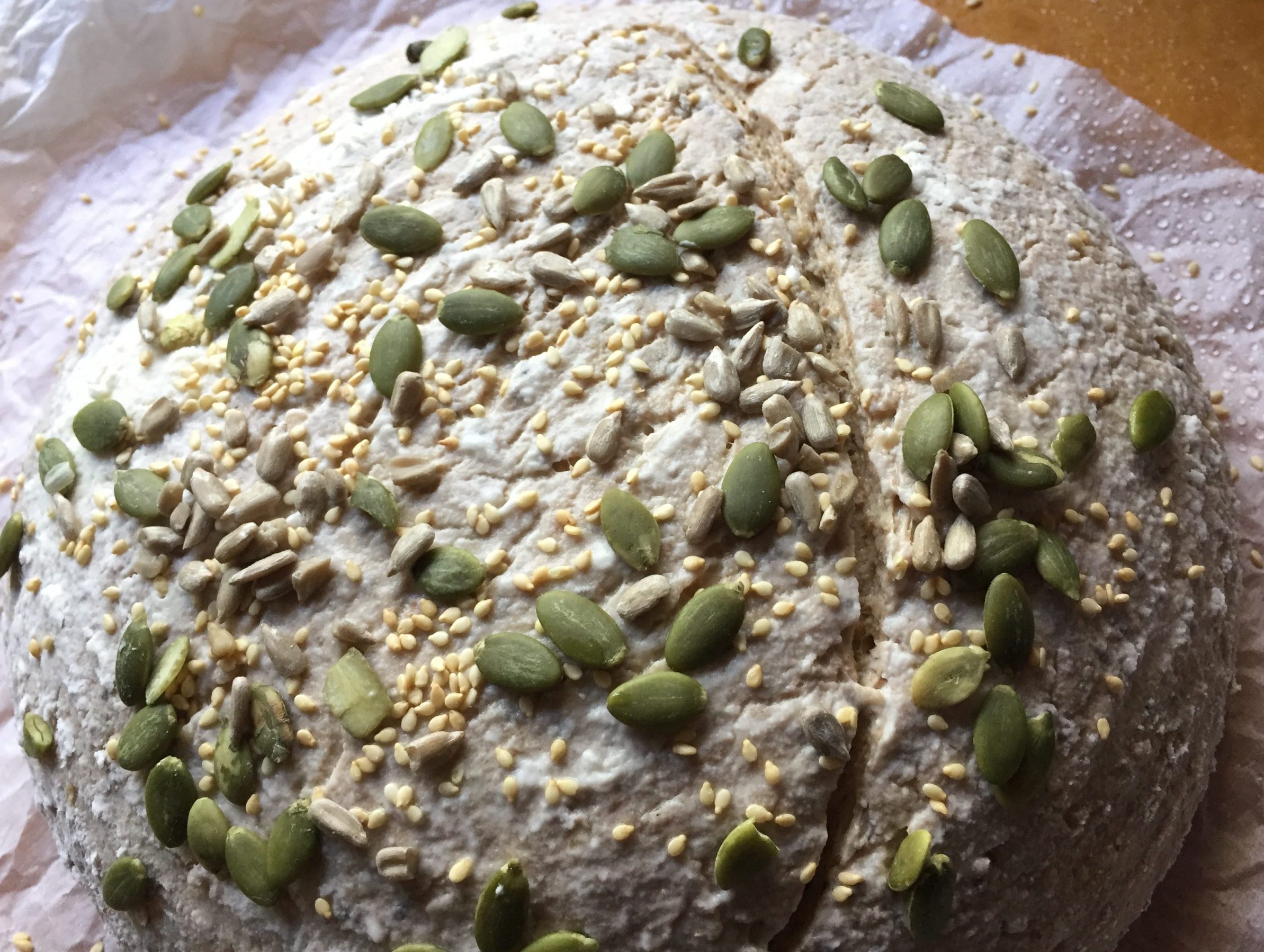 - Transfer dough onto parchment paper, score and place in oven with lid on. Due to the seeds and multigrain, this bread is not very conducive to elaborate scoring. Save the fancy scoring for your plain breads!