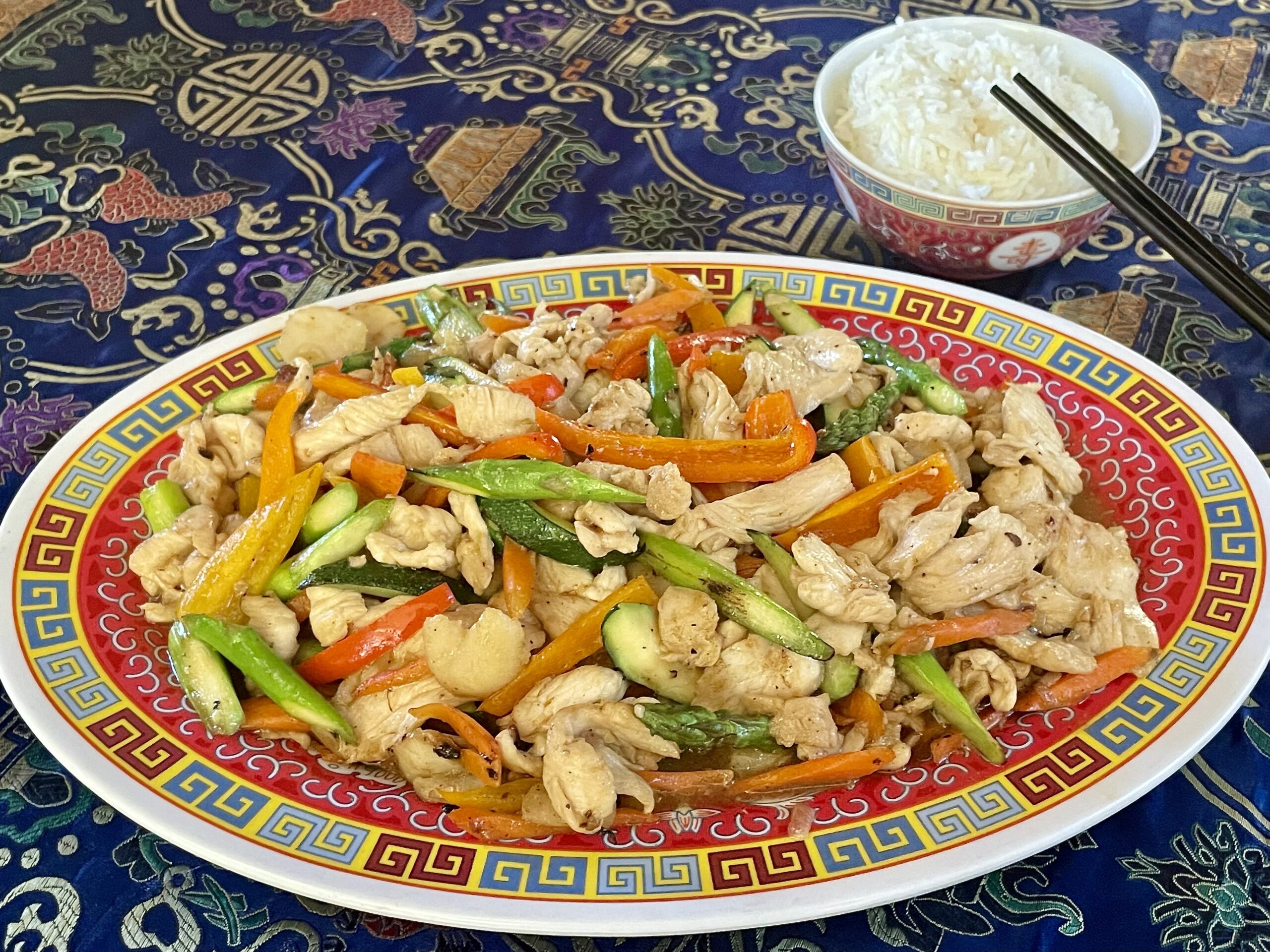 Add the vegetable requiring the longest cooking time. Stir fry until 50% cooked. If the vegetable requires more intense heat, cover the pan / work with a lid for a few seconds. (You can also add a little water /chicken stock to quickly steam the vegetable.)